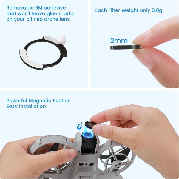- 【Package Include】 Includes a small hard plastic case,1* Magnetic Attraction Plate,5-pack Neo ND filter set (UV ND8, ND16 ,ND32 and ND64), (NOTE: DJI Neo drone and other accessories are NOT INCLUDED!)